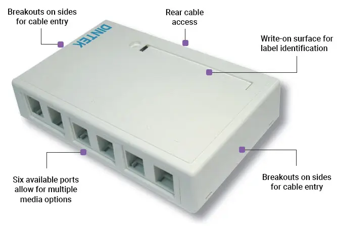 De MUTOA is geschikt voor verschillende typen bekabeling. Ethernet aansluitingen kunnen met DINTEK keystones direct afgemonteerd worden in de behuizing. Voor het afmonteren van fiber kabels zijn connectoren beschikbaar.